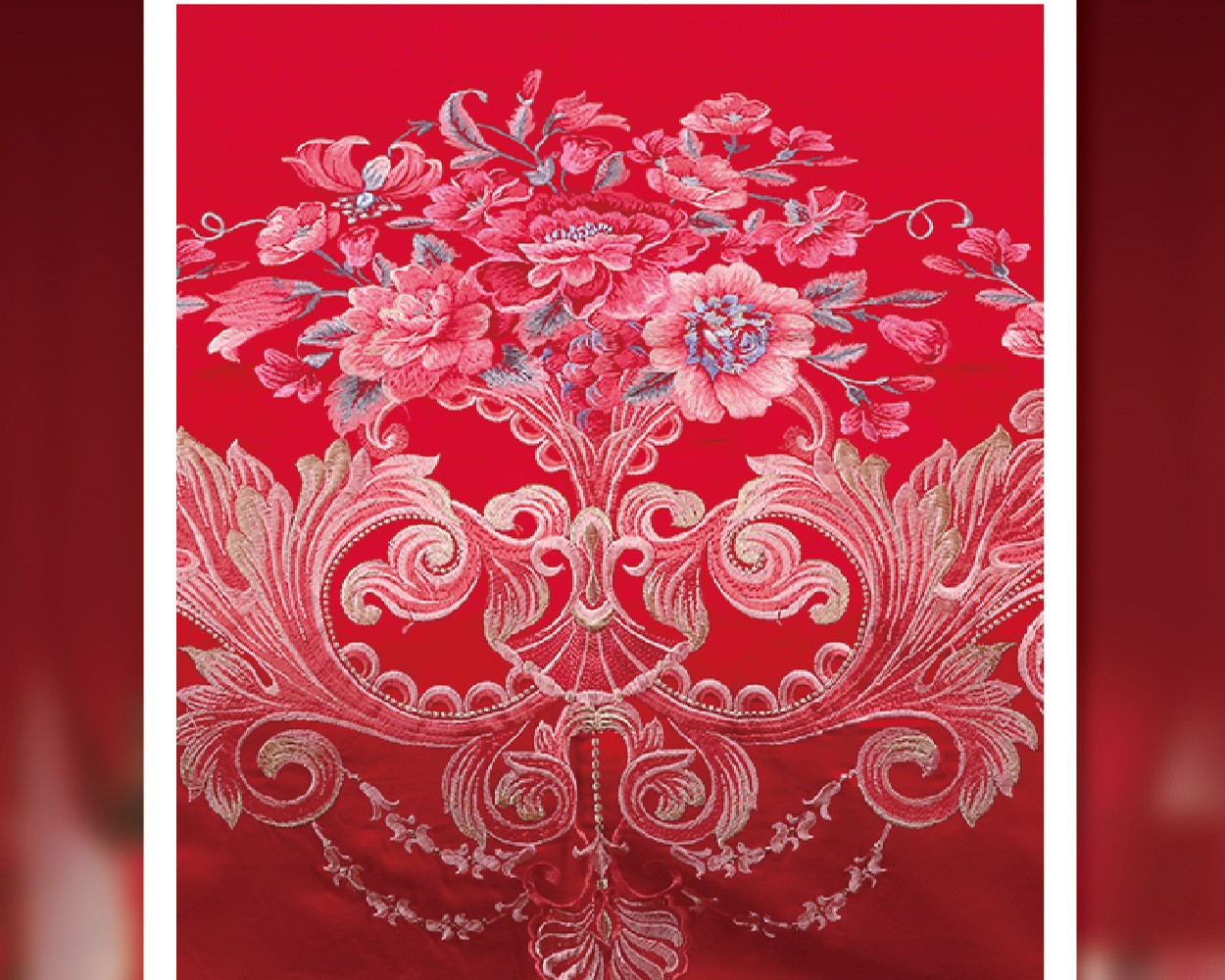 描述:大紅喜慶風(fēng)婚慶四件套,設(shè)計融入傳統(tǒng)婚慶意象,大紅花繡花寓意著愛情的甜美和一生的祝福,100%選用優(yōu)質(zhì)新疆長絨棉編織而成,比起普通全棉四件套具有縮水率低,不易掉色,更加柔軟親膚等特點,高支高密的雙色立體提花工藝,加上寫實的表現(xiàn)手法,讓圖案表現(xiàn)的更加細膩生動。