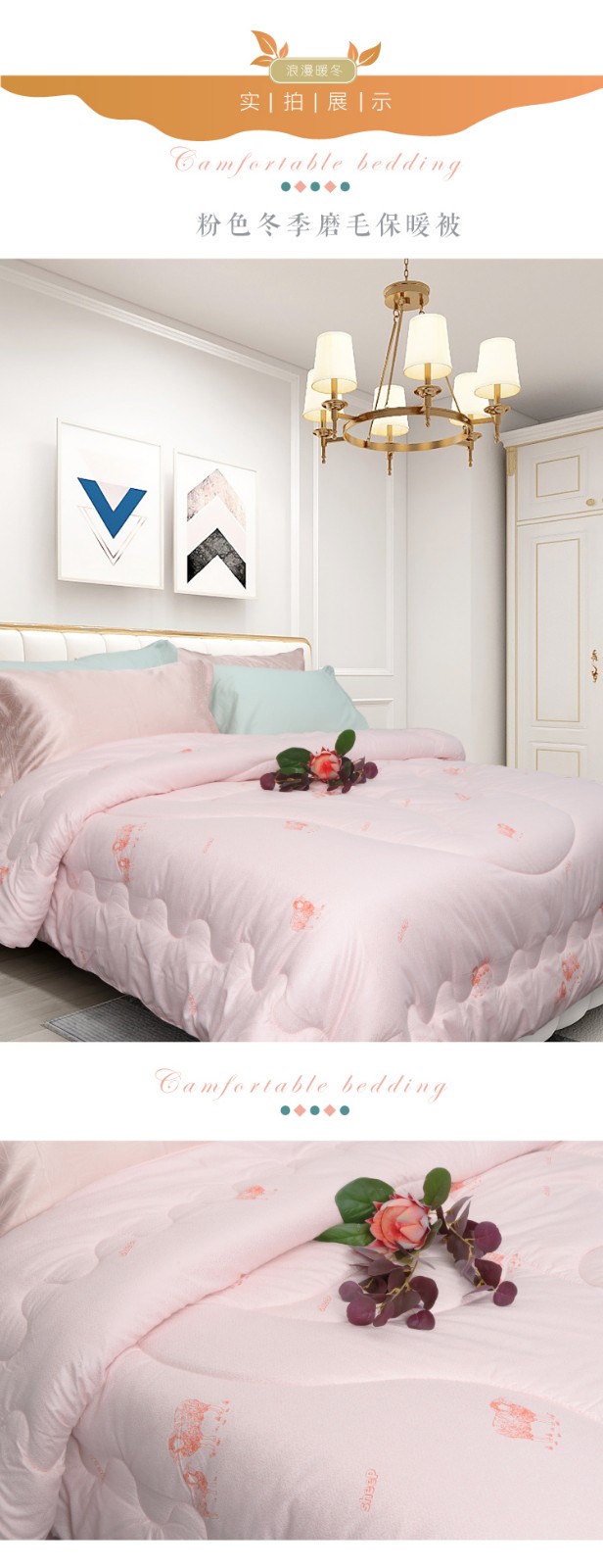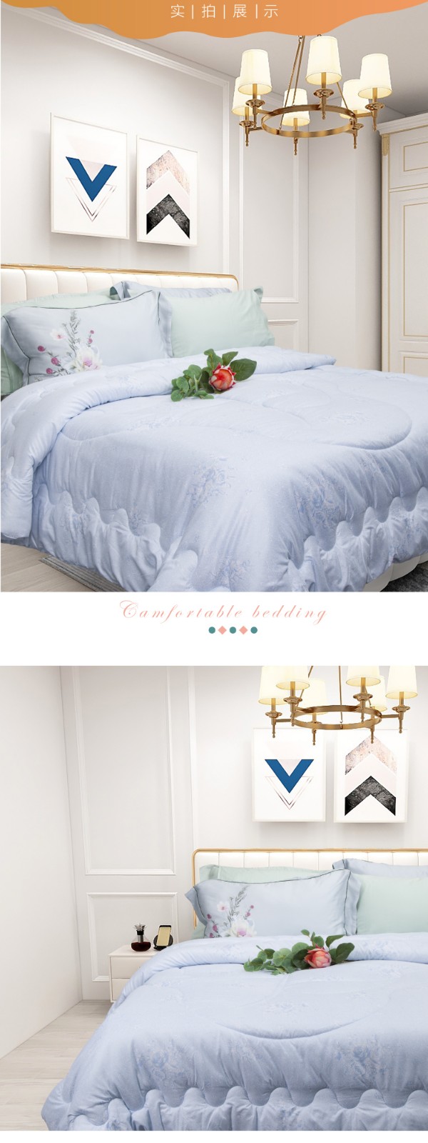 描述:被芯全7孔棉填充,活性印花工藝、綠色健康、色牢度高、舒適耐用、精湛絎縫、大方邊角設(shè)計(jì)、保暖又大氣,兩色任選