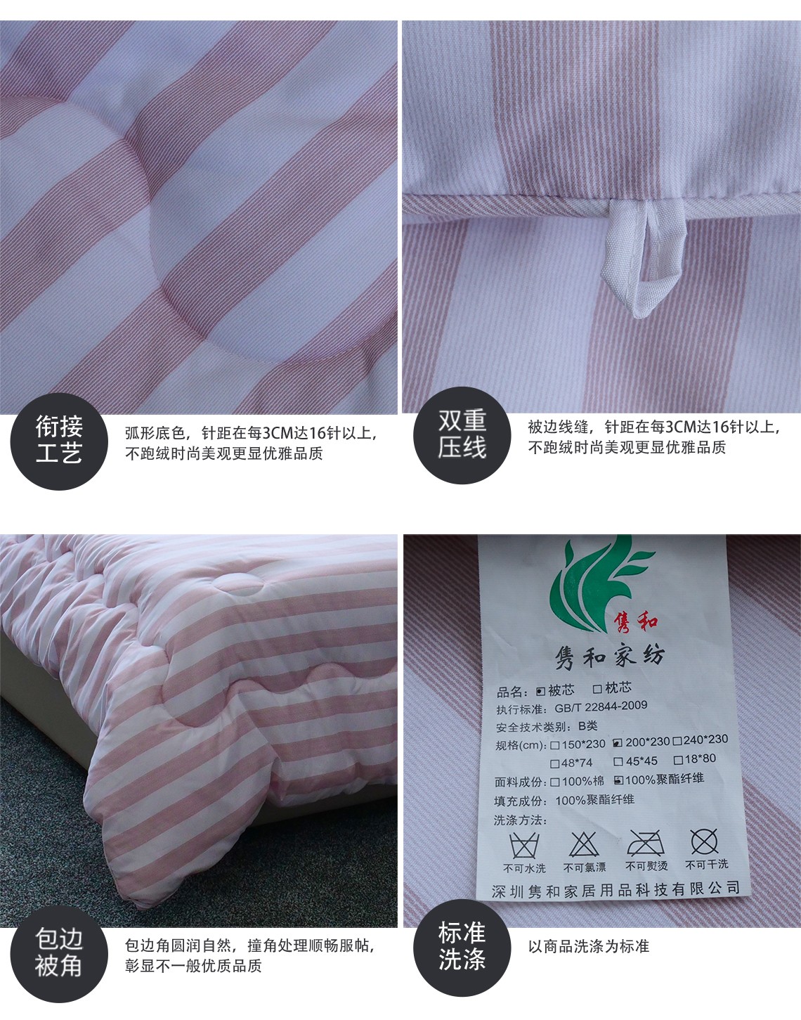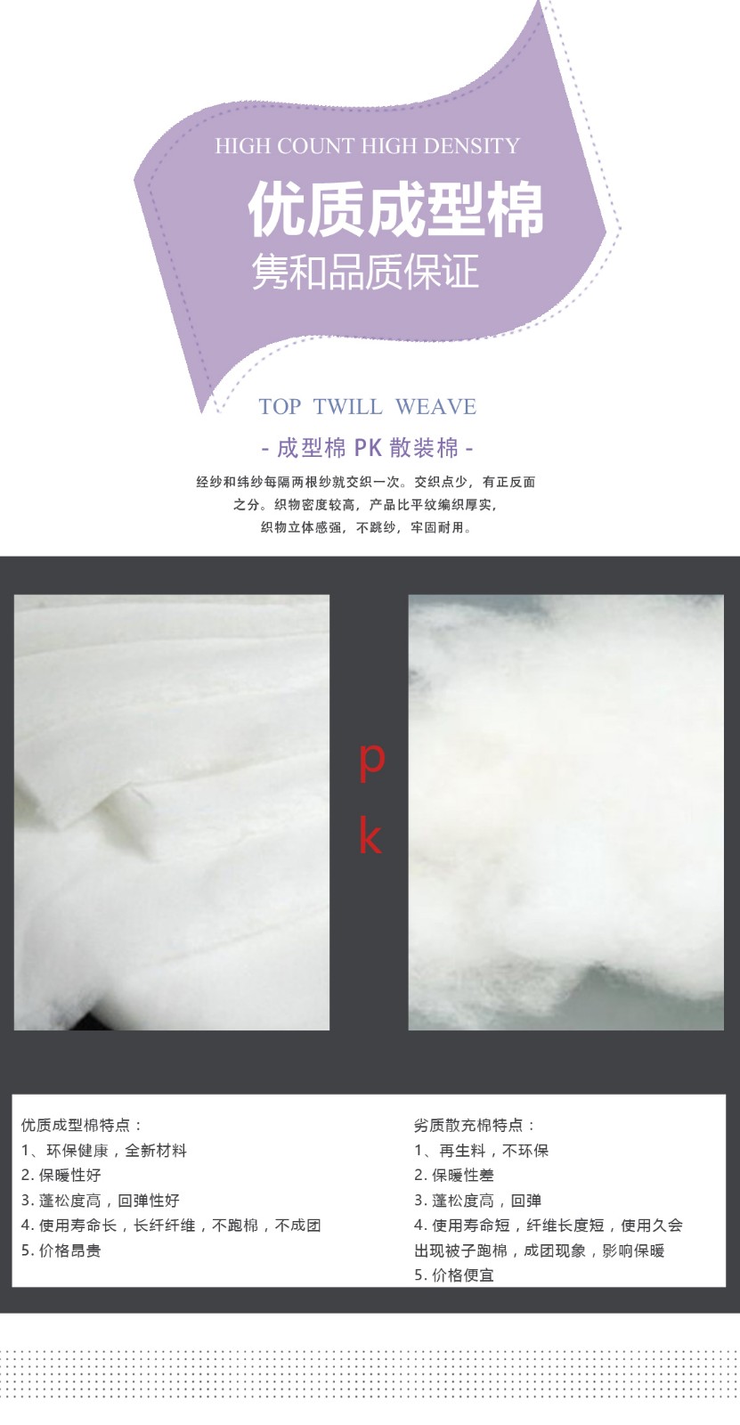 描述:獨特的抗菌面料,能有效防止細菌滋生,高品質(zhì)絎縫設備絎縫花型精致包邊工藝,成型棉結(jié)構(gòu),不會造成被芯里的棉揉團打結(jié),舒適柔滑保暖。