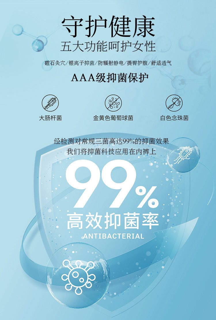 描述:精蘭莫代爾面料.內(nèi)鑲18顆生物磁片,24小時釋放磁能量,更有銀離子抑菌、防輻射、舒適透氣,再也不用擔(dān)心例假的痛苦,呵護(hù)女性每一天