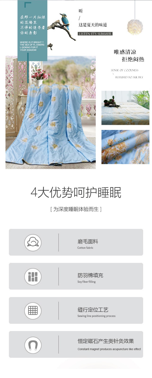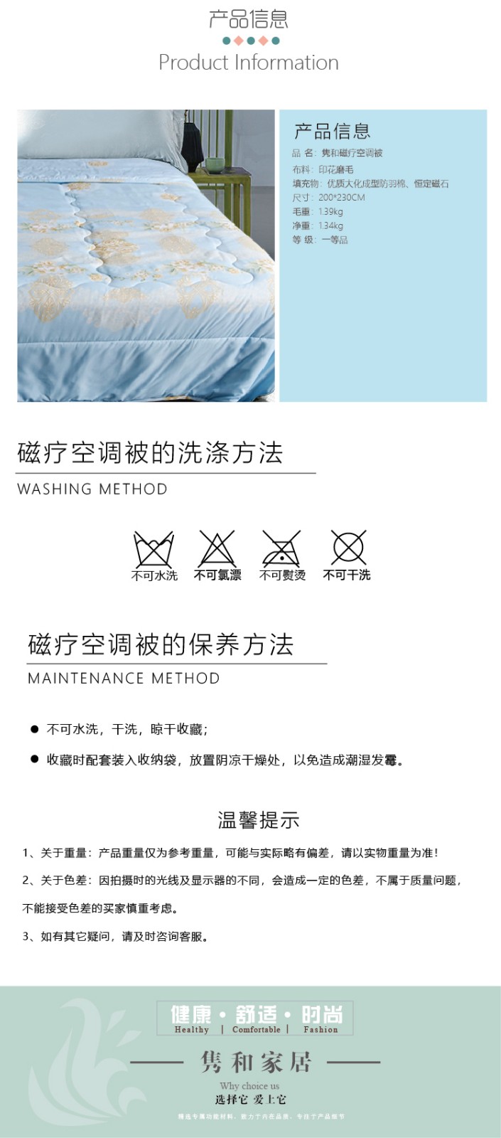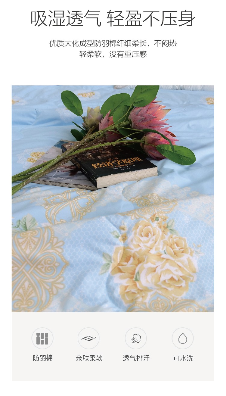 描述:磨毛面料親膚柔軟細(xì)膩,降低與肌膚的摩擦,貼近肌膚更溫柔,優(yōu)質(zhì)大化成型防羽棉纖細(xì)柔長,不悶熱輕柔軟,沒有重壓感 ,采用科學(xué)的磁粒排布,產(chǎn)生立體磁場讓全身沐浴在磁場中,補(bǔ)充身體能量。優(yōu)質(zhì)染料印染印花圖案精致靈動水洗不易褪色,色彩清新耐看