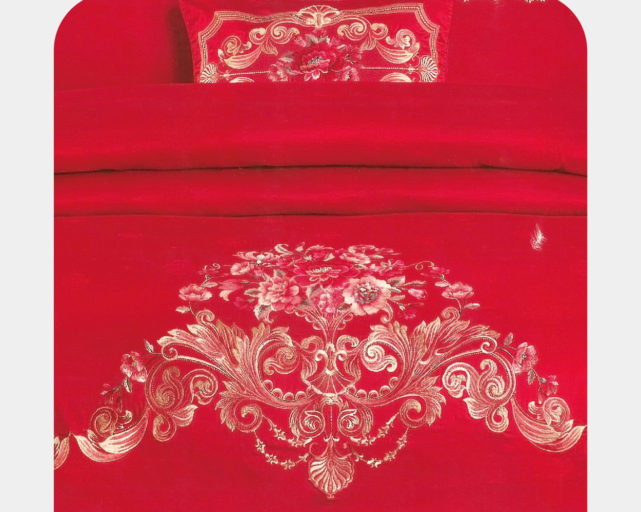描述:大紅喜慶風(fēng)婚慶四件套,設(shè)計融入傳統(tǒng)婚慶意象,大紅花繡花寓意著愛情的甜美和一生的祝福,100%選用優(yōu)質(zhì)新疆長絨棉編織而成,比起普通全棉四件套具有縮水率低,不易掉色,更加柔軟親膚等特點,高支高密的雙色立體提花工藝,加上寫實的表現(xiàn)手法,讓圖案表現(xiàn)的更加細膩生動。