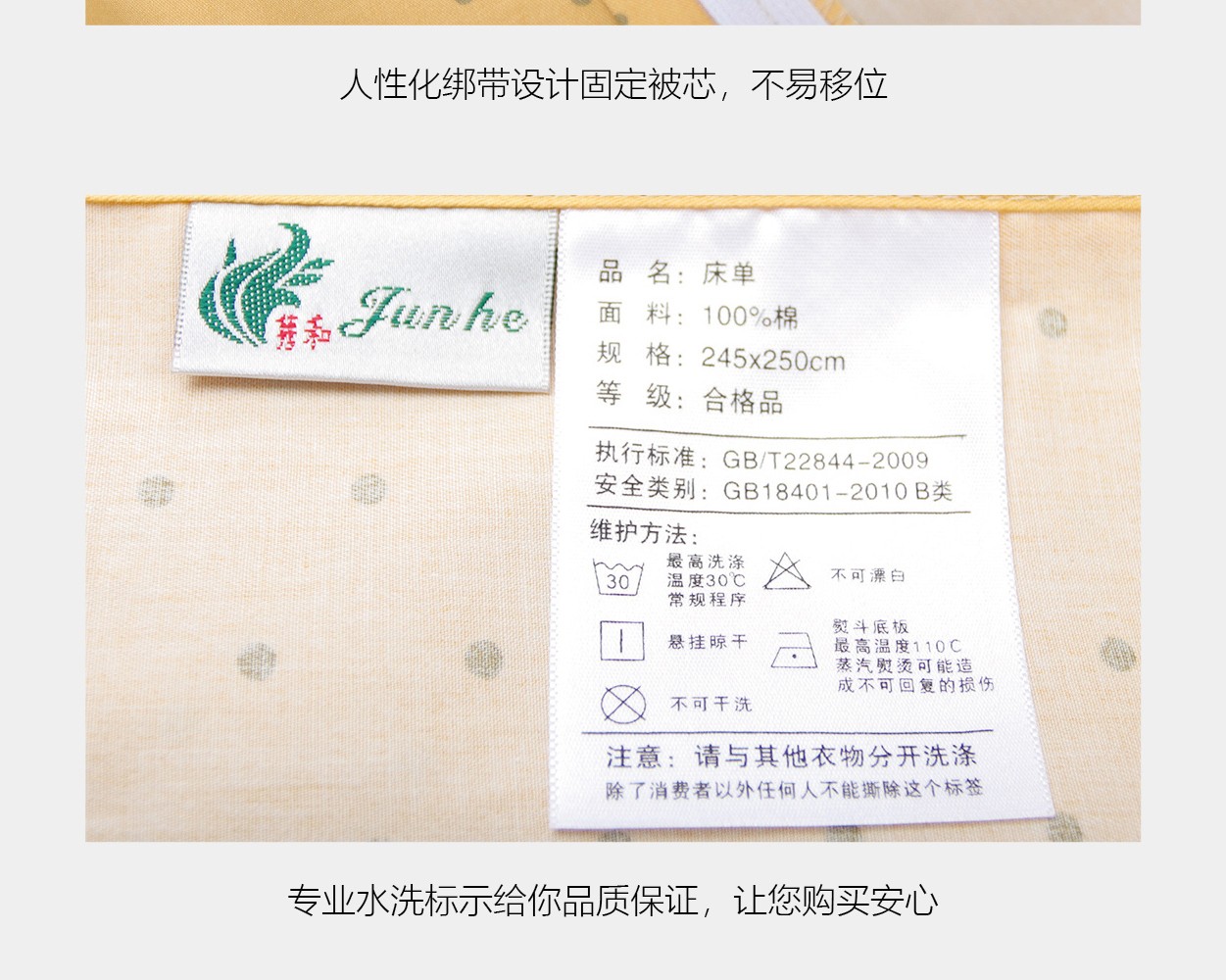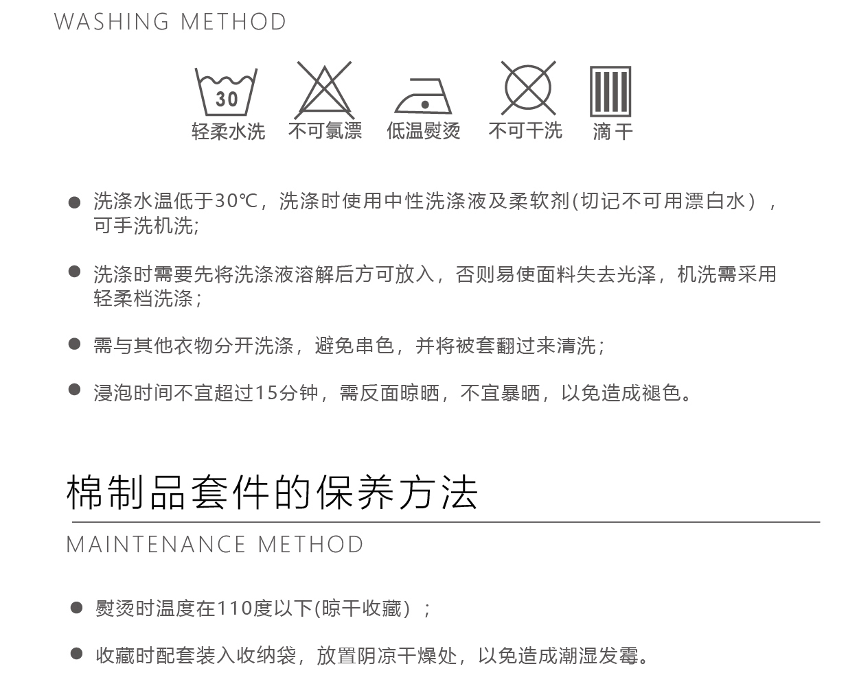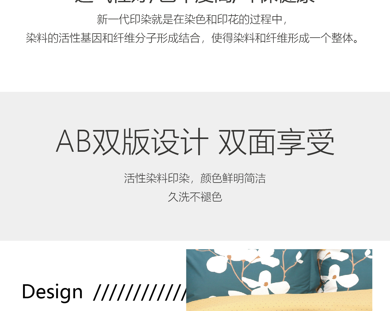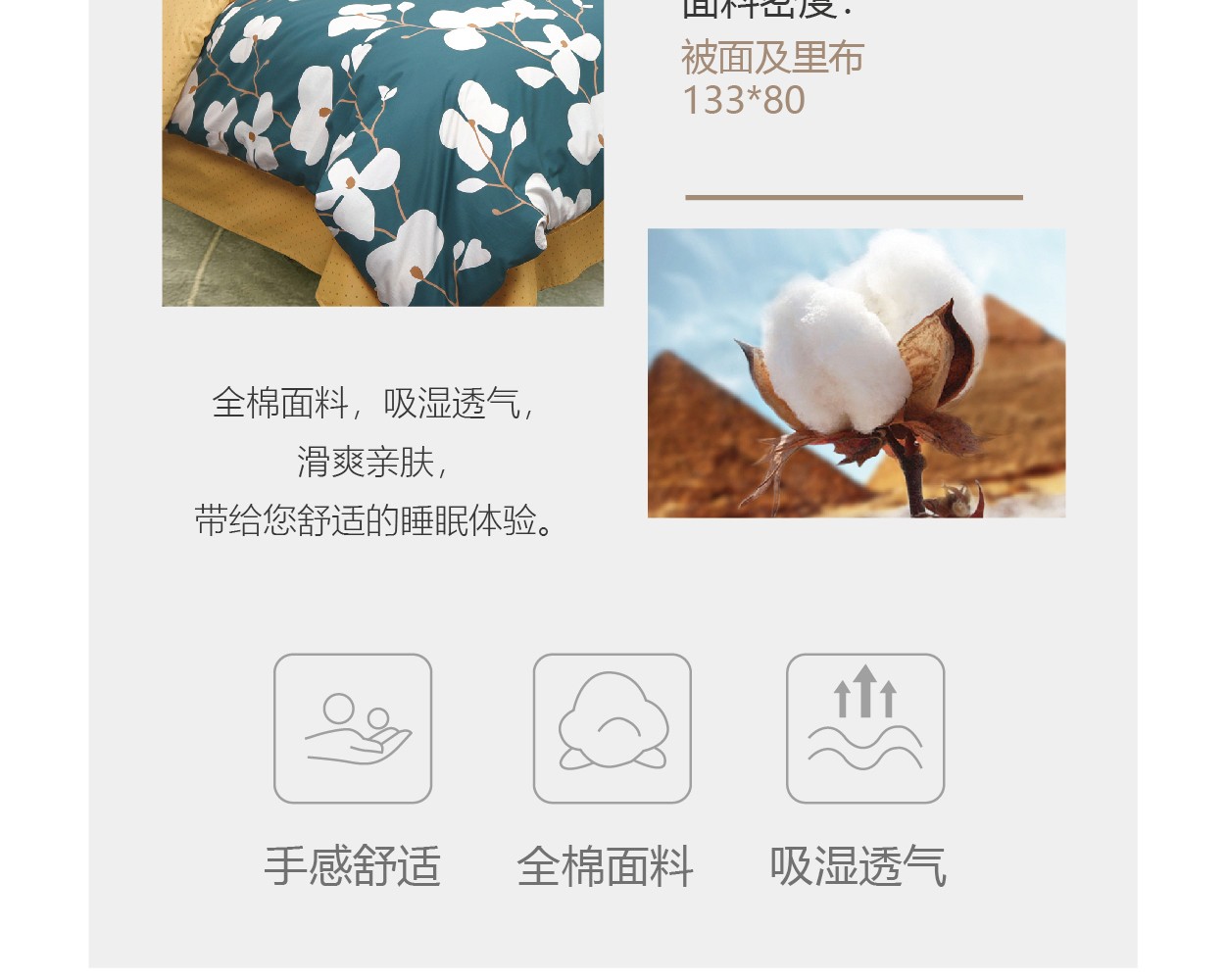 描述:100%純棉面料,優(yōu)質(zhì)環(huán)保印染工藝,無任何甲醛、增白劑、安全環(huán)保健康 全工序純棉精織,柔軟舒適,吸濕透氣,帶給您舒適的睡眠體驗。
