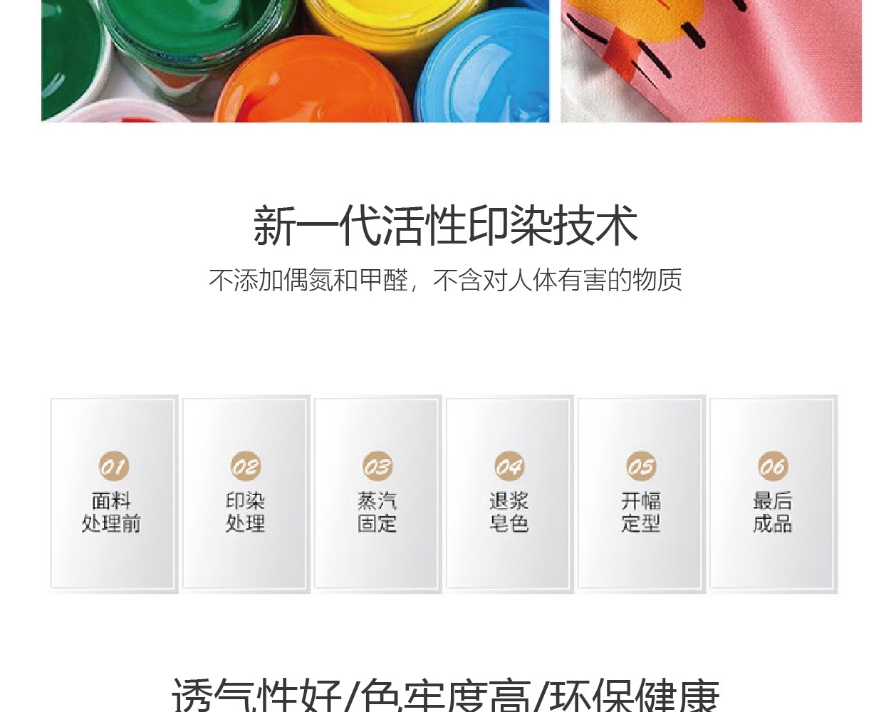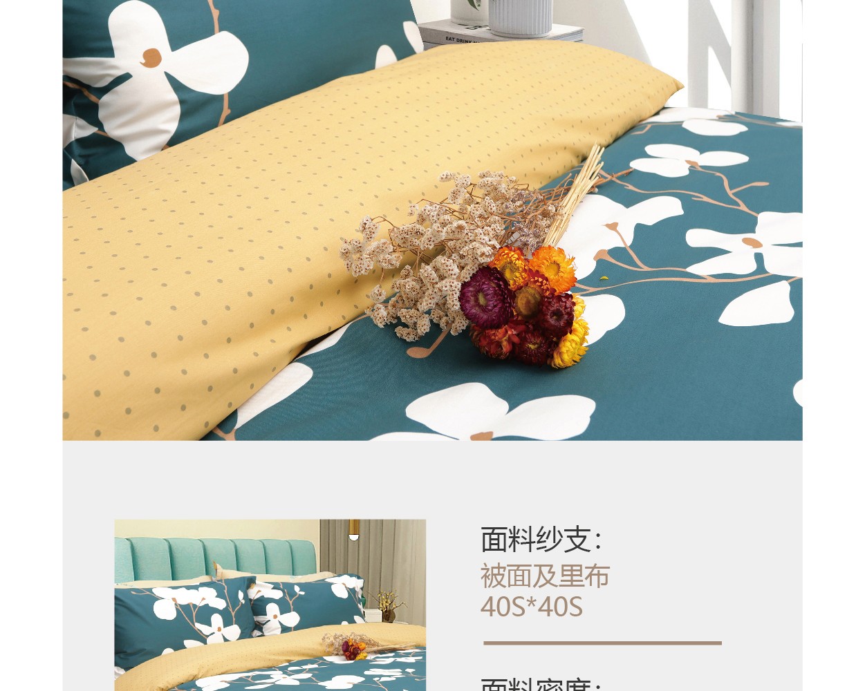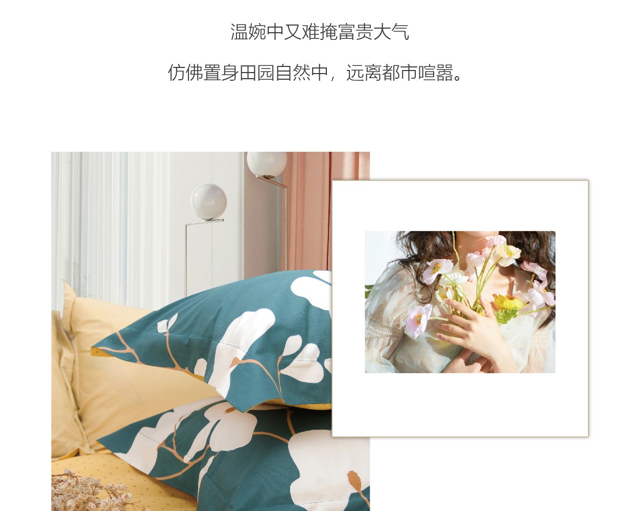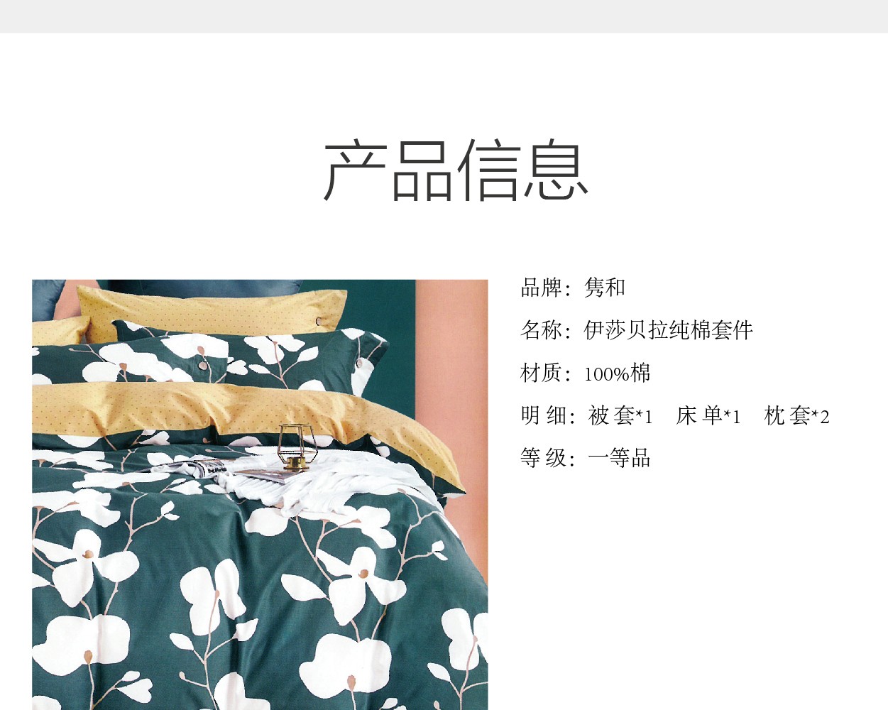 描述:100%純棉面料,優(yōu)質(zhì)環(huán)保印染工藝,無任何甲醛、增白劑、安全環(huán)保健康 全工序純棉精織,柔軟舒適,吸濕透氣,帶給您舒適的睡眠體驗。