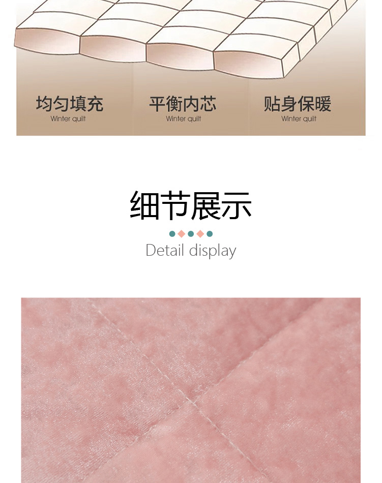 描述:采用雙層設(shè)計(jì),不壓身,完美鎖住溫度,優(yōu)質(zhì)面料柔軟親膚,固定填充不板結(jié)不變形。