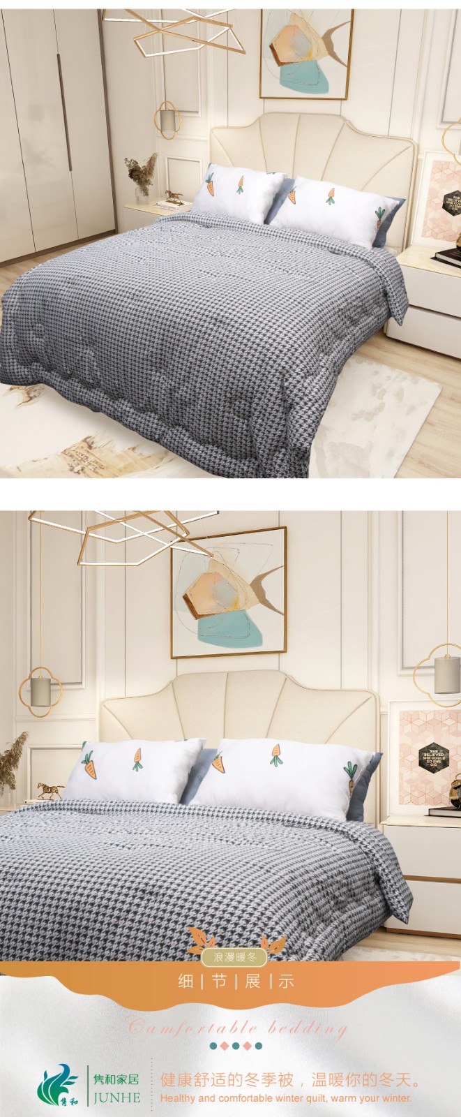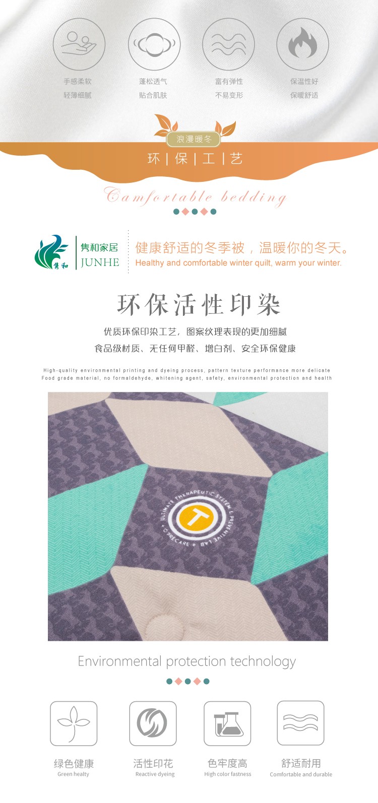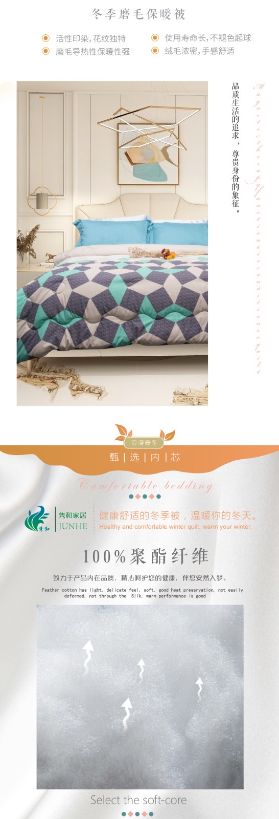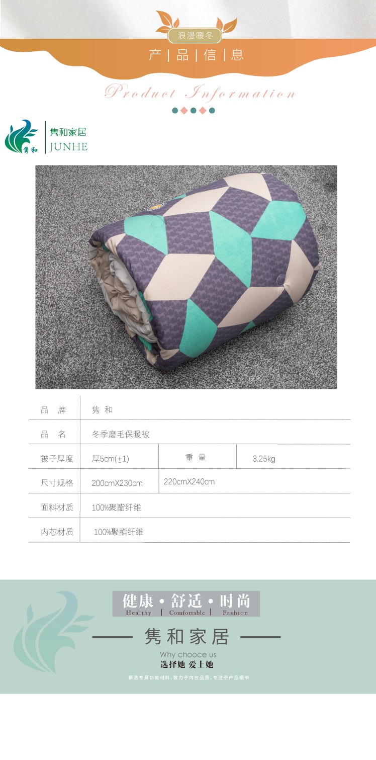 描述:100%聚酯纖維棉,大方設計,面料柔軟細膩、親膚透氣 優(yōu)質(zhì)環(huán)保印染工藝,無任何甲醉,增白劑,更健康,跟保暖,更實惠