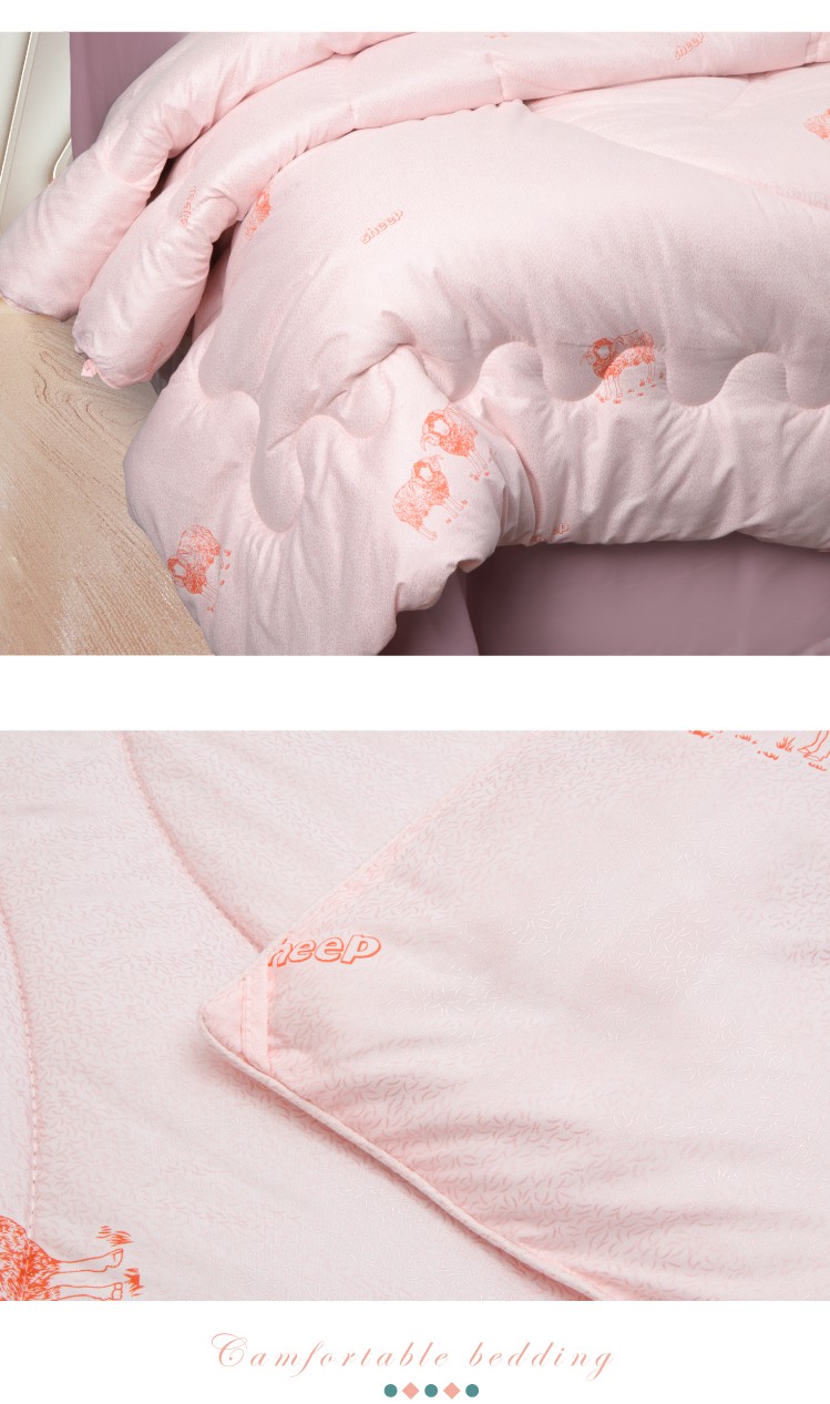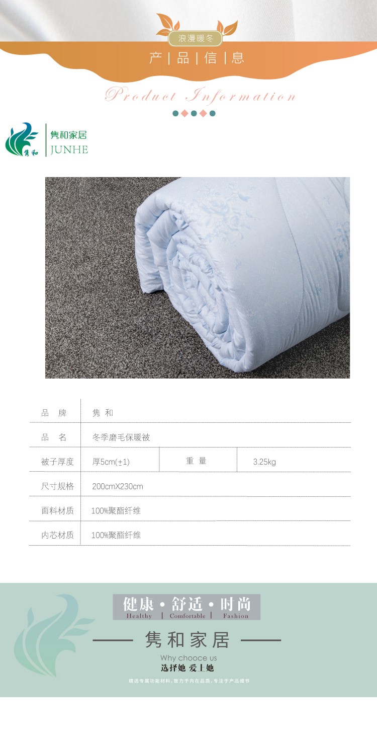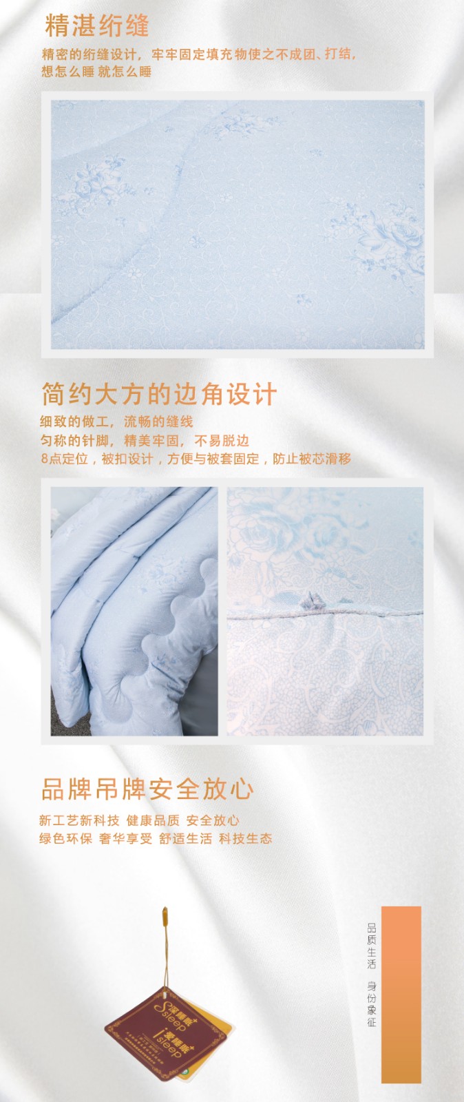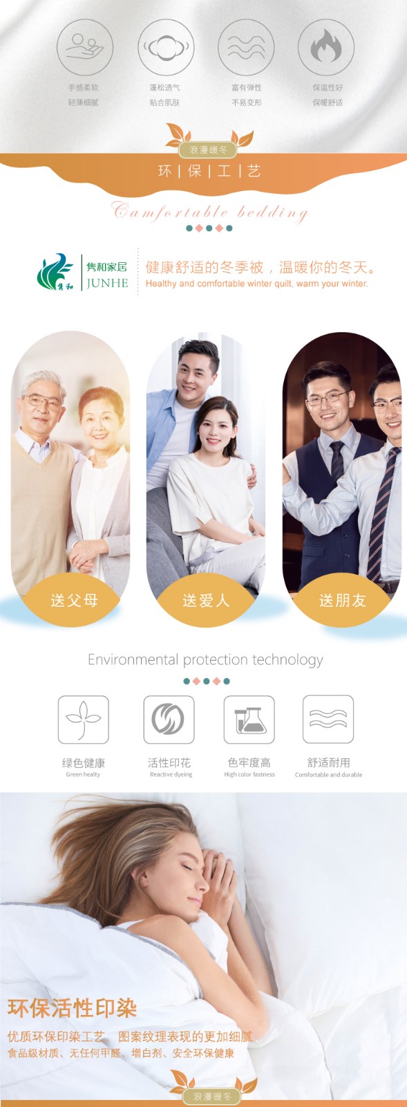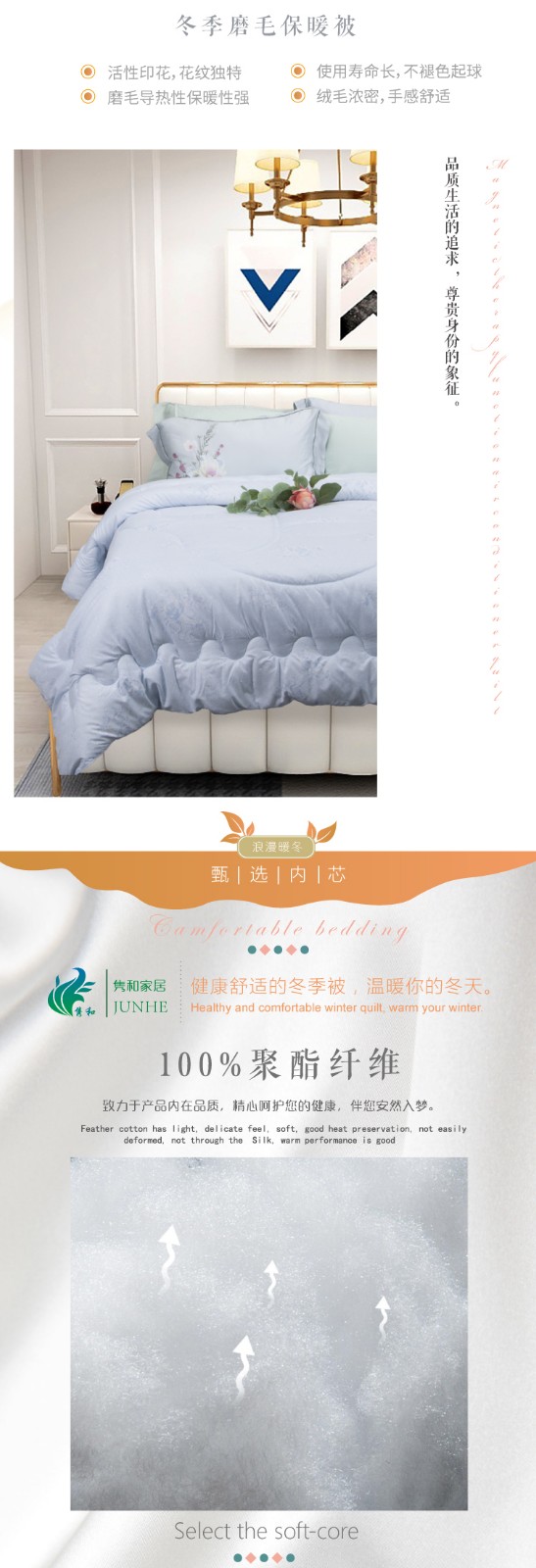 描述:被芯全7孔棉填充,活性印花工藝、綠色健康、色牢度高、舒適耐用、精湛絎縫、大方邊角設(shè)計(jì)、保暖又大氣,兩色任選