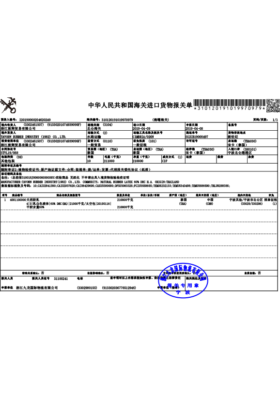 乳膠泰國進(jìn)口報(bào)關(guān)單