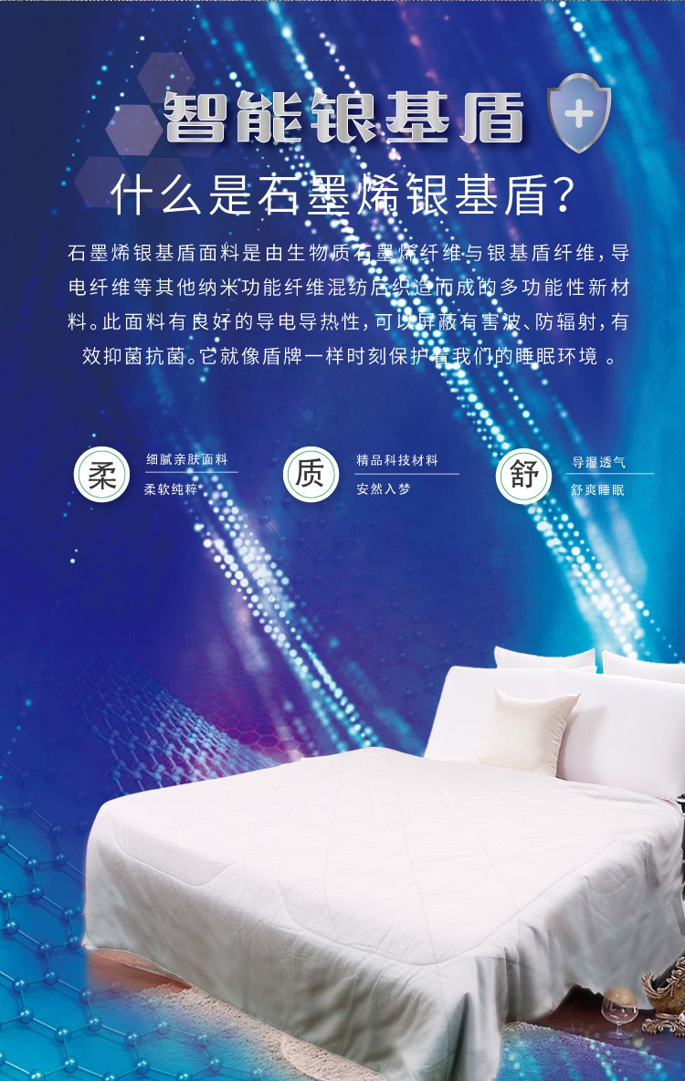 描述:具有石墨烯蓄能發(fā)熱.遠紅外生命光波,防輻射電磁波屏蔽,銀纖維抗菌抑菌、超導性抗靜電等功能,全面呵護您的睡眠健康,帶給你云一般的舒適體驗。