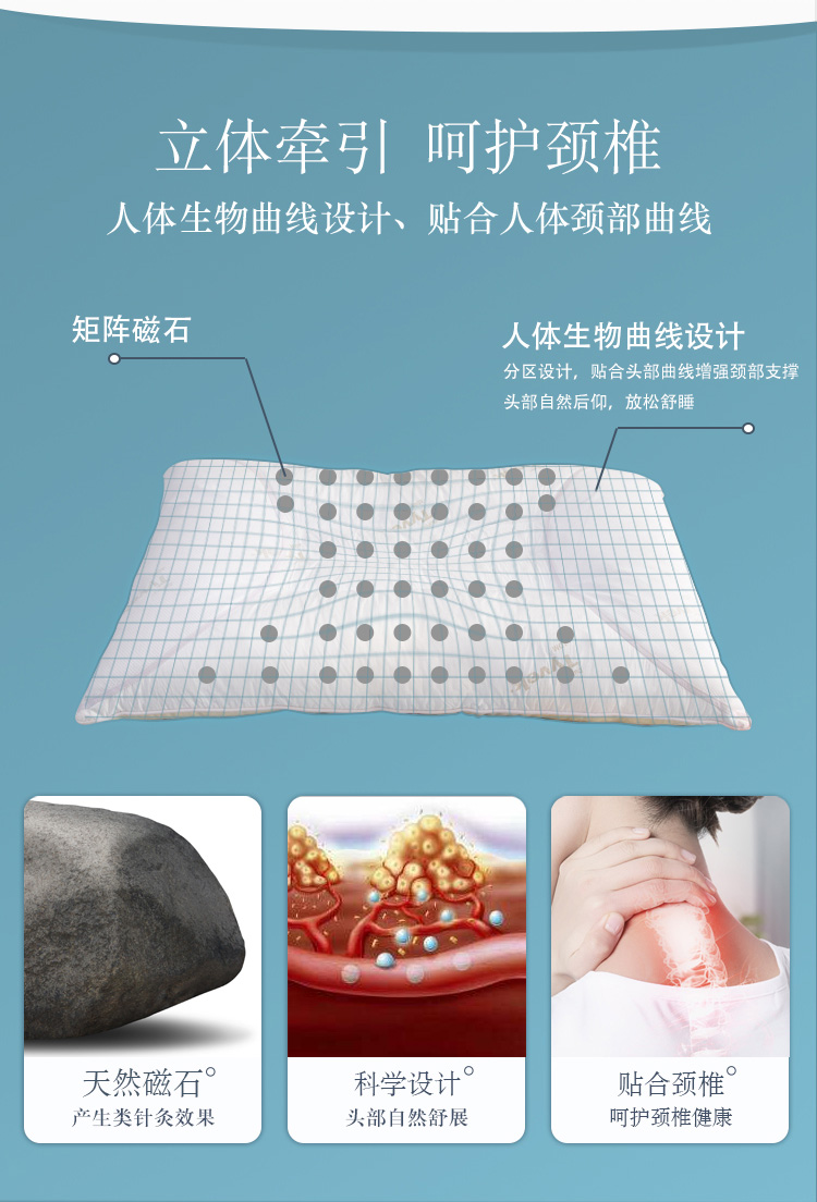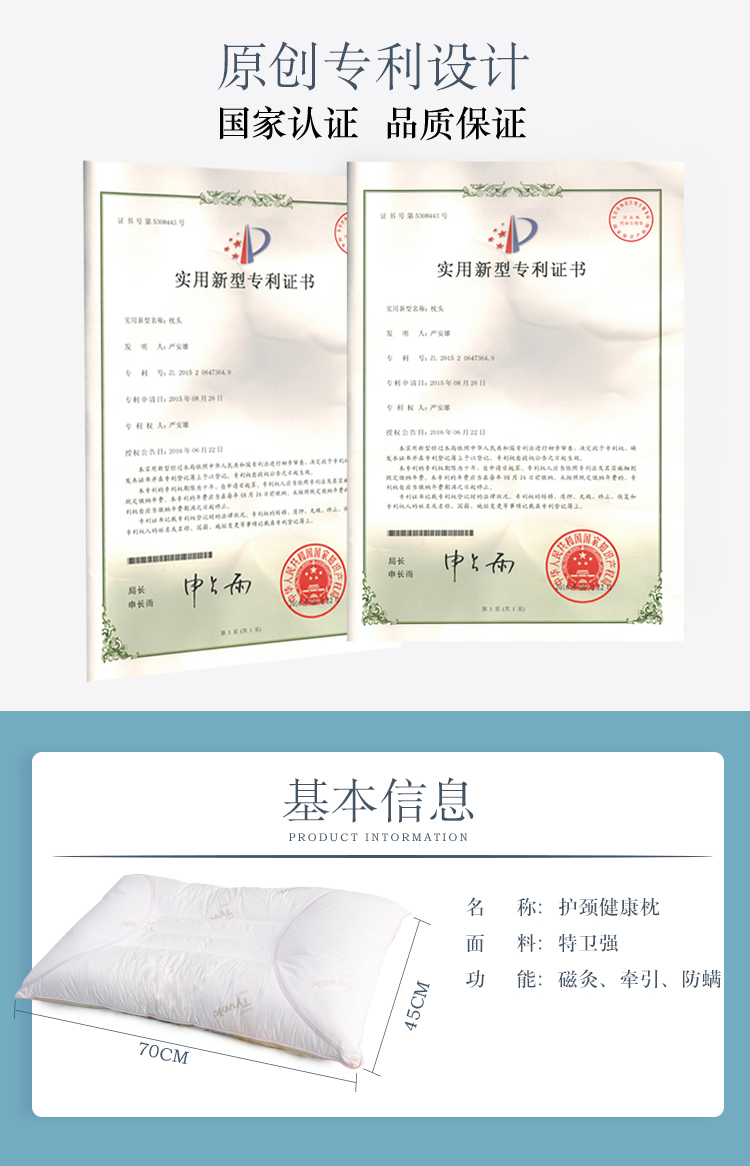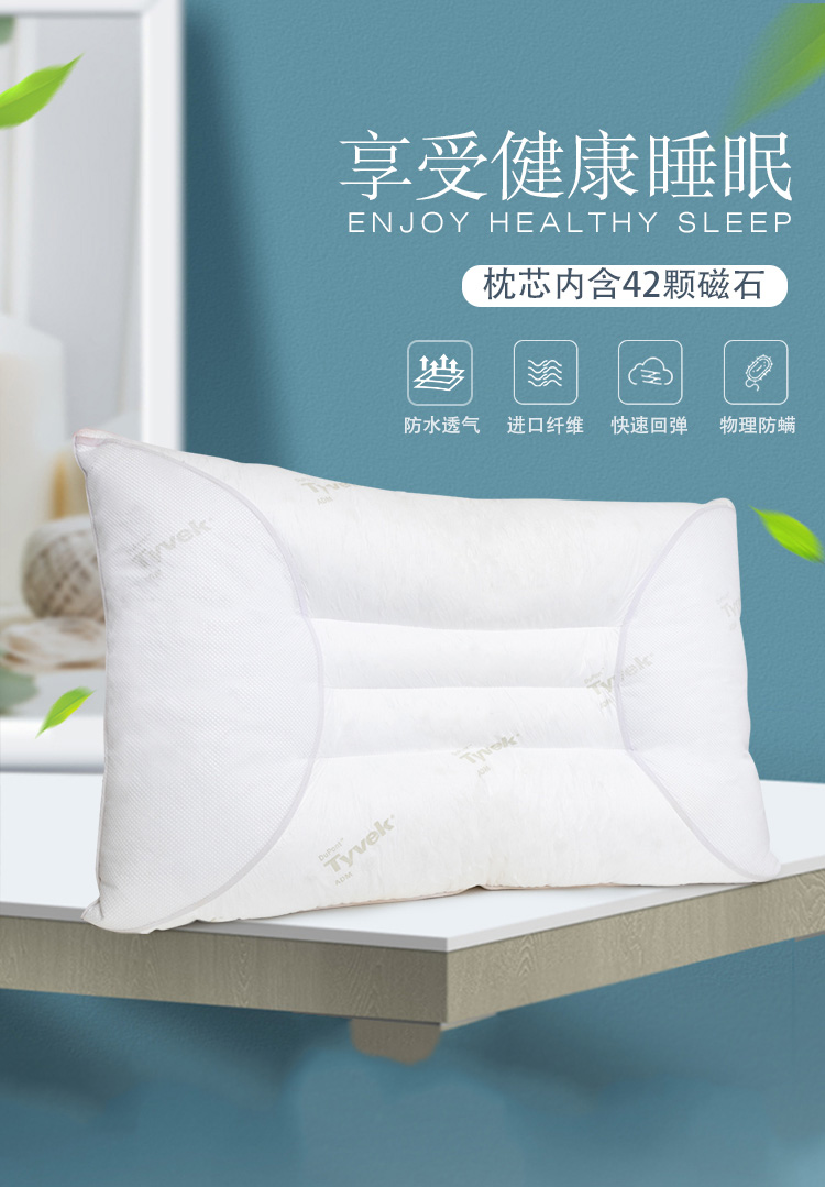 描述:專利產(chǎn)品,采用進(jìn)口特衛(wèi)強(qiáng)面料,透氣防螨、具有99%超強(qiáng)的防螨效果,內(nèi)部填充生物磁石,能刺激頸部穴位,呵護(hù)睡眠