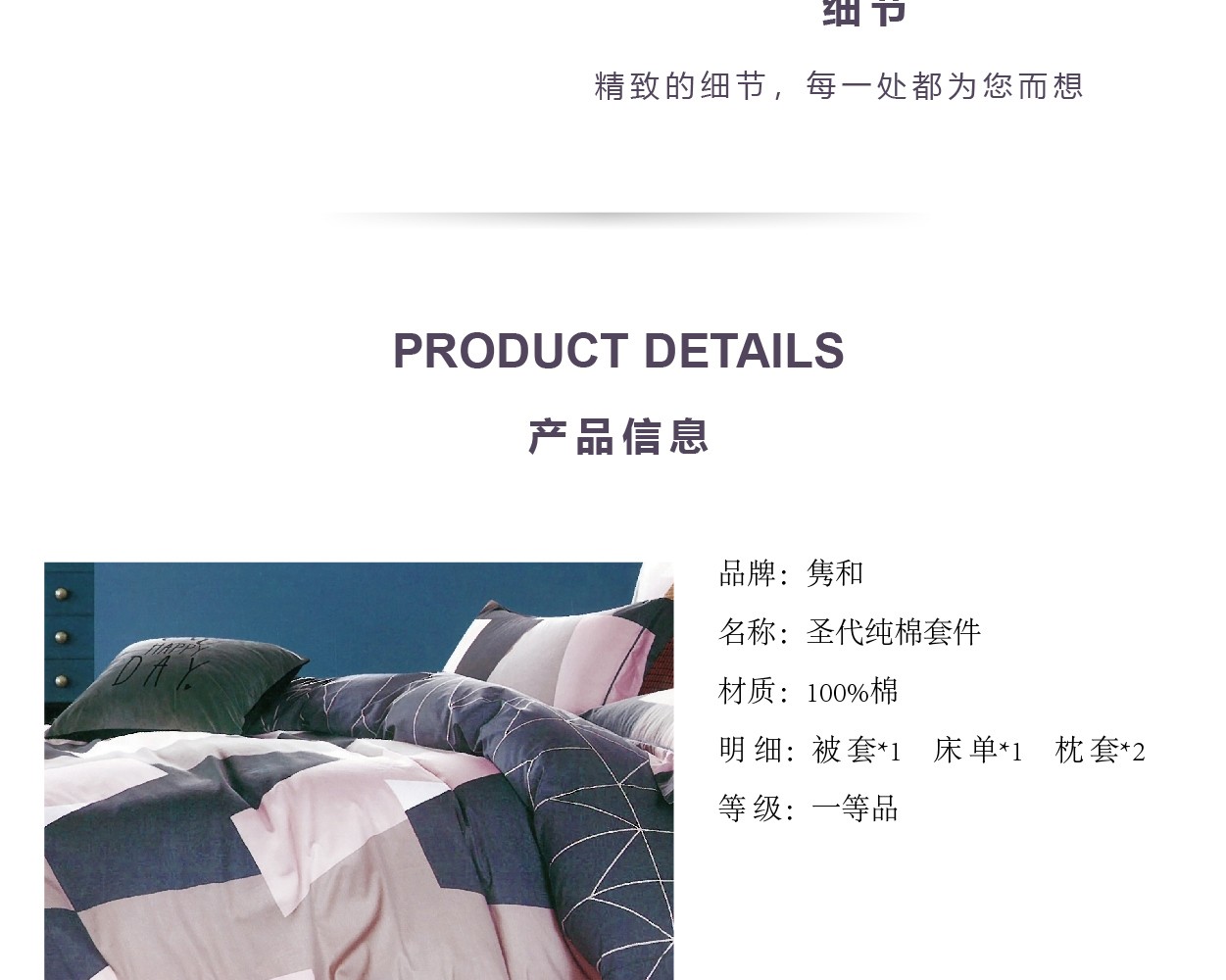 描述:100%純棉面料、活性印花工藝、不脫色不掉色、健康環(huán)保 全工序純棉精織,柔軟舒適,吸濕透氣,帶給您舒適的睡眠體驗。