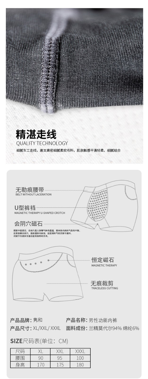描述:進(jìn)口蘭精莫代爾再料,內(nèi)鑲36顆磁石,24小時(shí)釋放磁能量。U型囊袋設(shè)計(jì),讓三角區(qū)更加寬敞,托瑪琳養(yǎng)護(hù)、抑菌、防輻射、舒適透氣,更能解決男人的難言之隱。