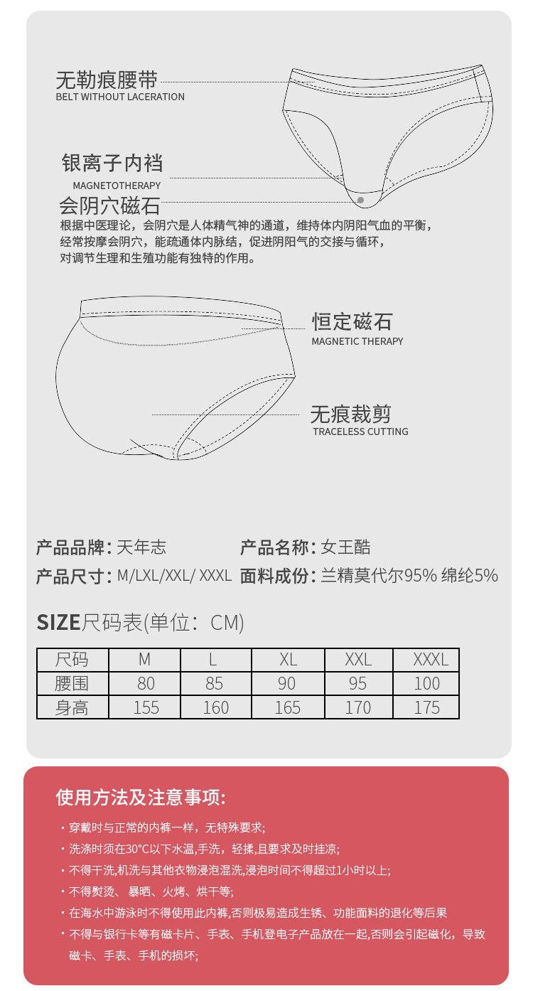 描述:穿上女王酷、枯木逄春生。強力抑菌護私密、婦科炎癥少惹你。 磁灸會陰穴,少得歸科病。提臀護腰腹,蕾絲勒無痕。
