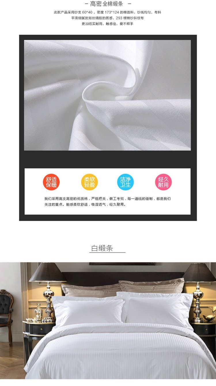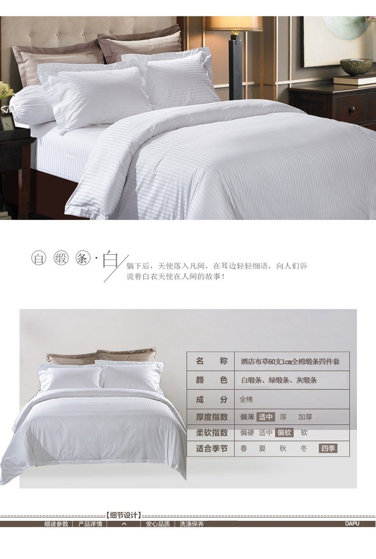 描述:本公司為客戶提供各種酒店布草,多種款式、支持來圖定制,均是全工藝一手品牌面料,細(xì)致考究的工藝,富裕每一個(gè)床品細(xì)膩如綢的柔軟觸感。