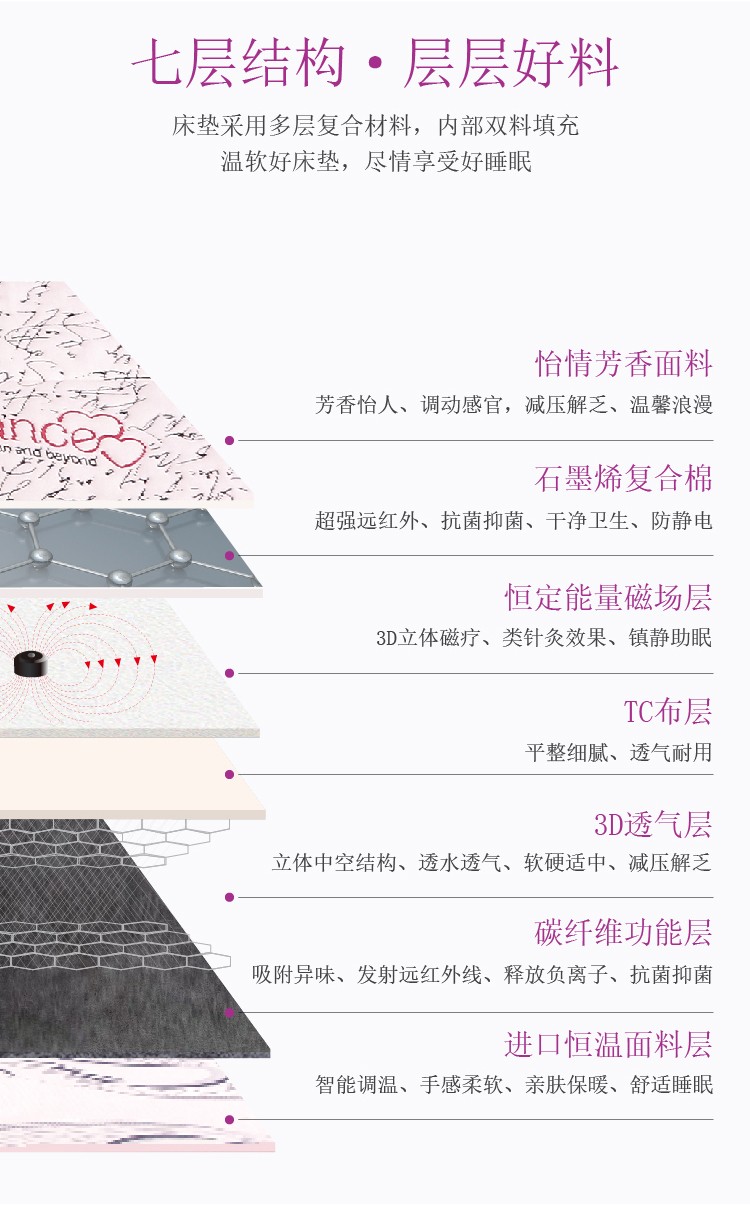 內(nèi)芯材質(zhì):石墨烯功能棉、恒定能量磁場層、高分子3D材料、竹炭纖維棉